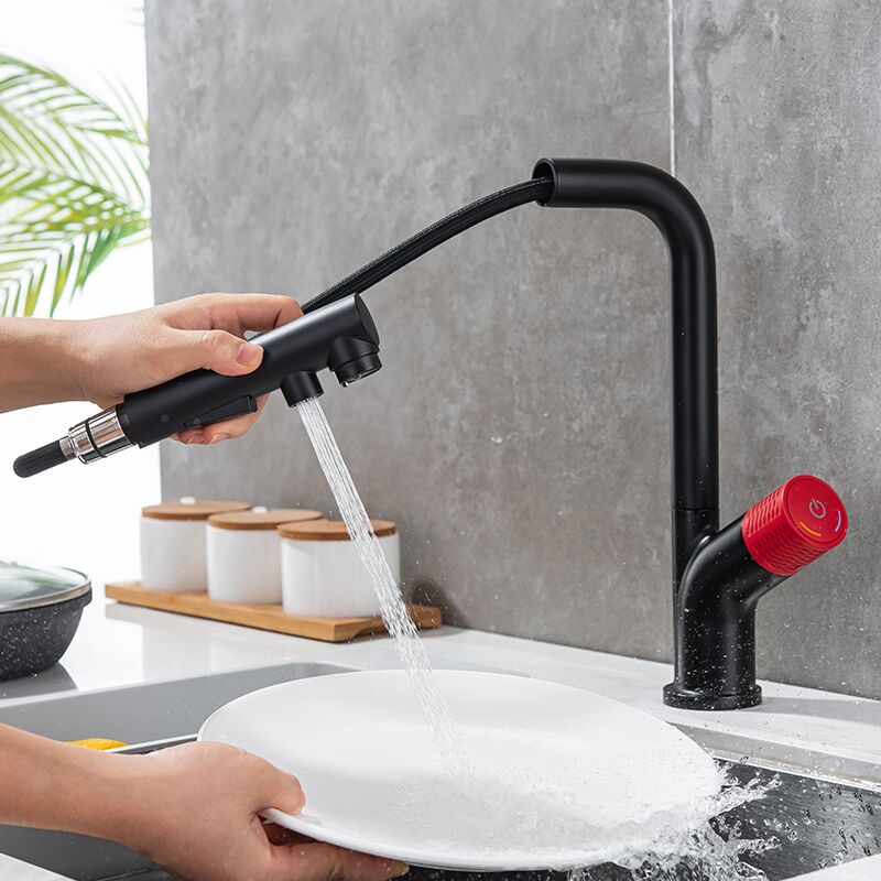 7-shaped matte black and red pull-out sprayer kitchen faucet with 360 degree nozzle hot and cold water faucet