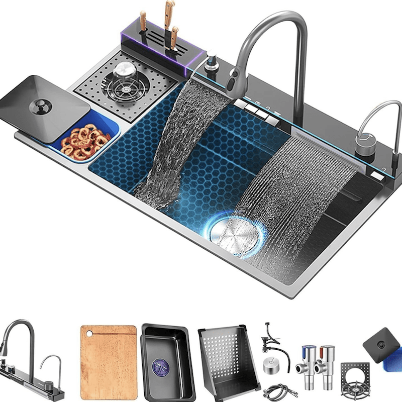 Black Modern Smart Kitchen Nano Stainless Steel Multifunctional Waterfall Sinks with Double Faucet for Restaurant