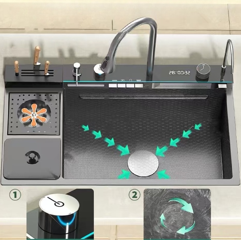 Smart Kitchen Faucet Double Waterfall Multifunctional Single Bowl Three-Hole Design for