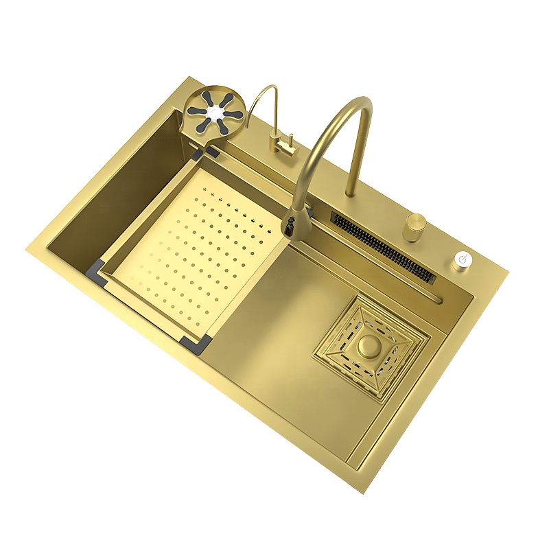 Gold Multifunctional Nano Kitchen Sinks with Cup Washer and Waterfall Faucet Modern 304 Stainless Steel Kitchen Sink