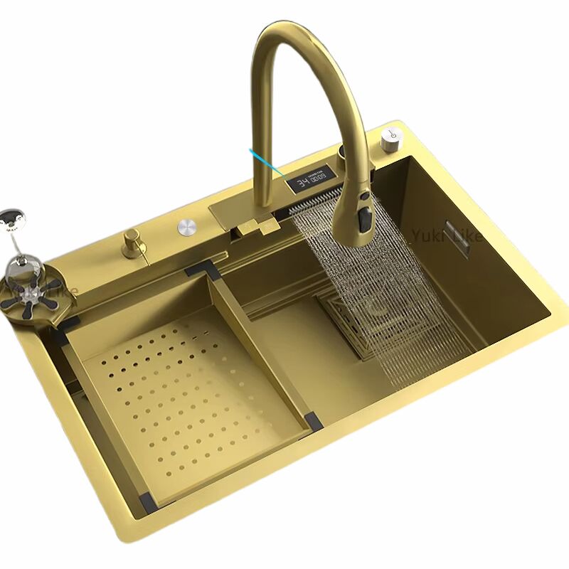 Gold Kitchen Sink Nano Pull-out Waterfall Faucet with Drainage Components and Accessories for Farmhouse Kitchen