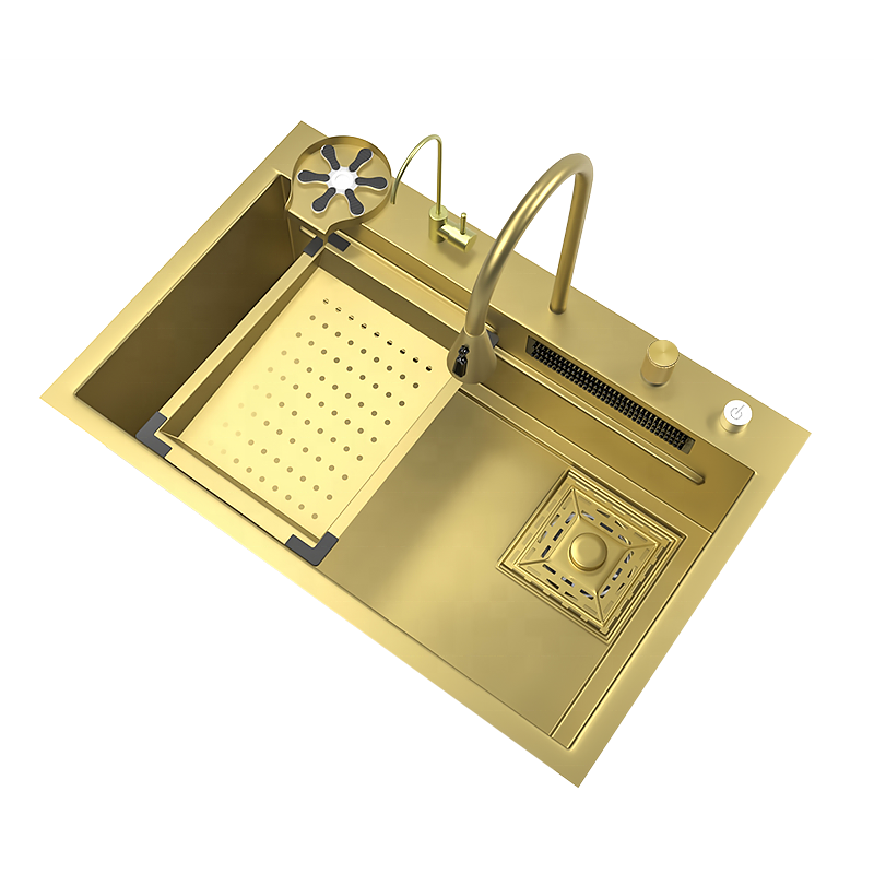 Gold Multifunctional Nano Kitchen Sinks with Cup Washer and Waterfall Faucet Modern 304 Stainless Steel Kitchen Sink