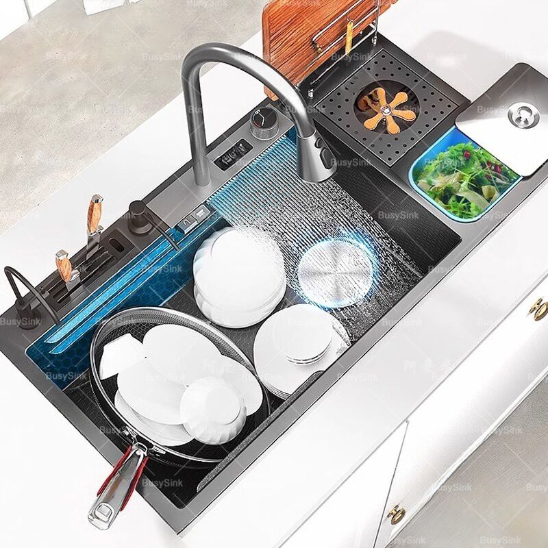 Kitchen Stainless Steel Sink with Knife Holder and Waterfall Faucet Digital Panel Set for Hotel Kitchen