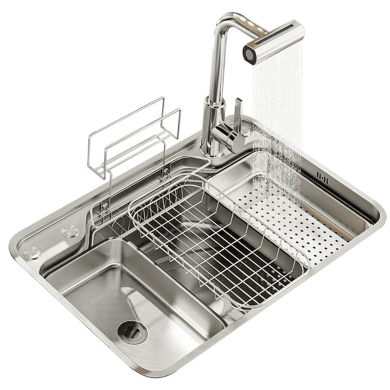Luxury Brushed Waterfall Single Bowl with Rice Grain Embossing Technology Multifunctional Sinks with Storage Rack