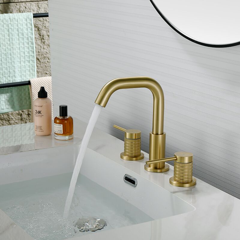 Luxury Widespread Basin Faucet 3 Holes Deck Mounted Vanity Faucet Copper Brushed Gold Knurled Rotatable Bathroom Sink Faucet