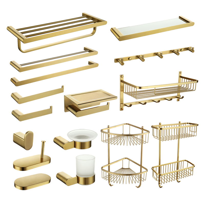 Modern Design Hotel Bathroom Accessories Set Wall-Mounted Brushed Gold Shower Parts & Toilet Hardware Stainless Steel Finishing