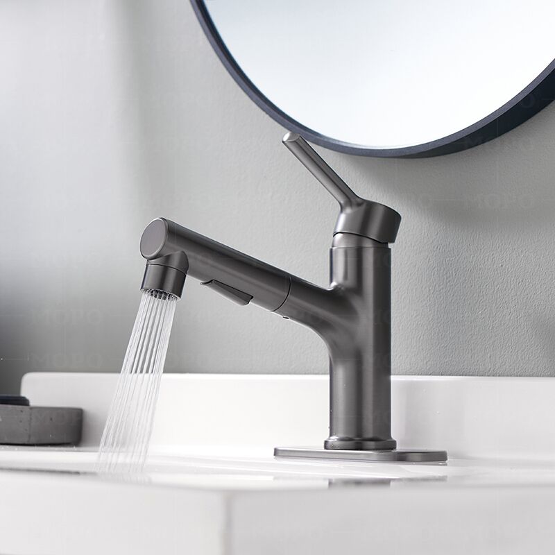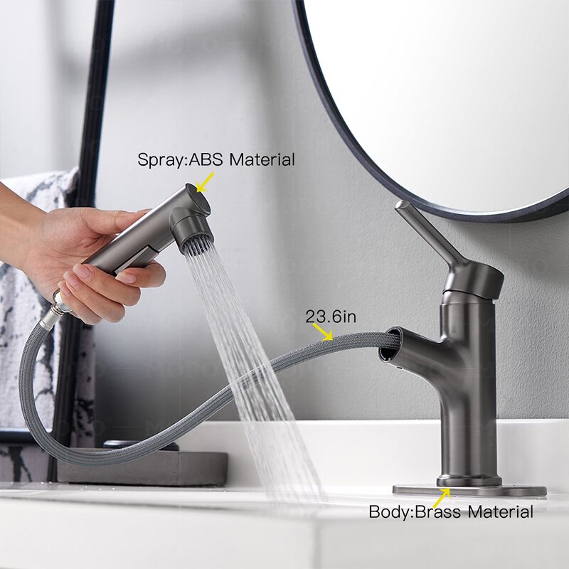Lubang tunggal paip bilik air tarik keluar presents people’s wisdom. This design is a truly innovative faucet. There is no doubt that a gunmetal grey finish incorporates perfectly into all decorations in your bathroom. 3 functional paip sink bilik mandi dan reka bentuk tarik keluar dengan hos panjang yang menjangkau di luar singki membawa kemudahan yang hebat untuk mencuci anda. Hanya tekan butang, dan anda akan menikmati 3 jenis pengalaman air, air pancut, aliran atau semburan. Dibina daripada bahan tembaga pepejal, yang keran bilik air adalah tahan lama dan tidak menitis. Memilih bahan berkualiti tinggi akan membantu anda dan keluarga anda selamat daripada Bahan Kimia.