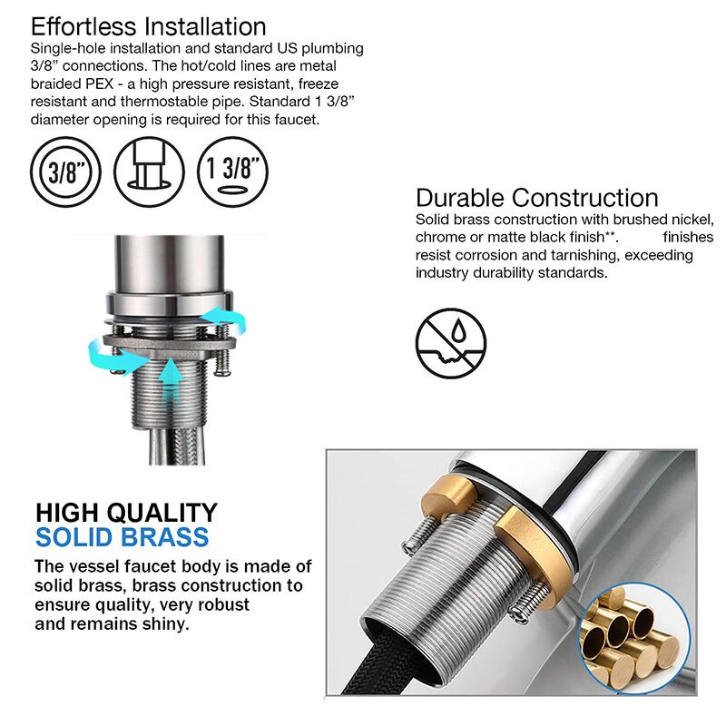Refined copper body: The faucet body utilizes a high-quality refined copper ingot with the adoption of the most advanced gravity casting technology in the world, and is manufactured by precision machining, totally natural, sturdy and durable.Solid brass construction to resist rust, corrosion.and tarnishSurface finish1.Nickel plating 10-12micrometer layer2 Chrome plating 3-5 micrometer layer3 Color plating3-5 micrometer layer48 hours salt spray test pass certificationFlawless finish:Customize the look to complementany bathroom design with a selection of flawlesscorrosion-resistant finishes