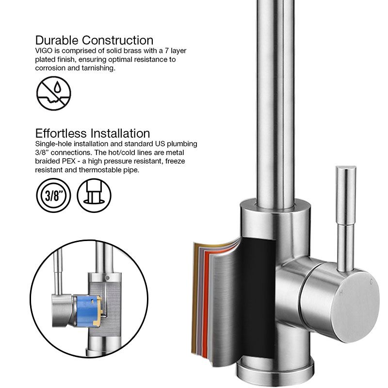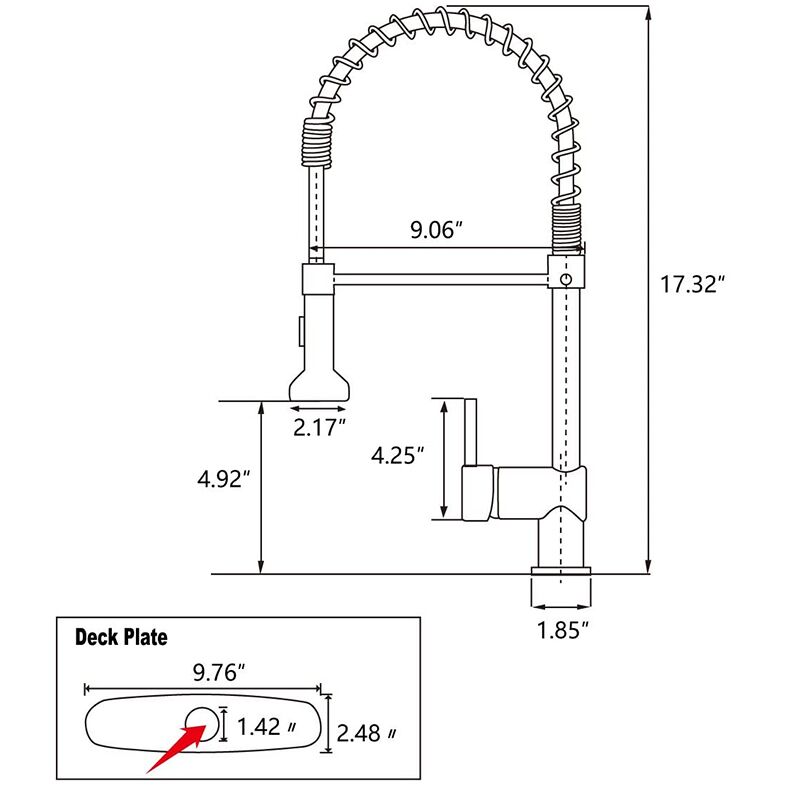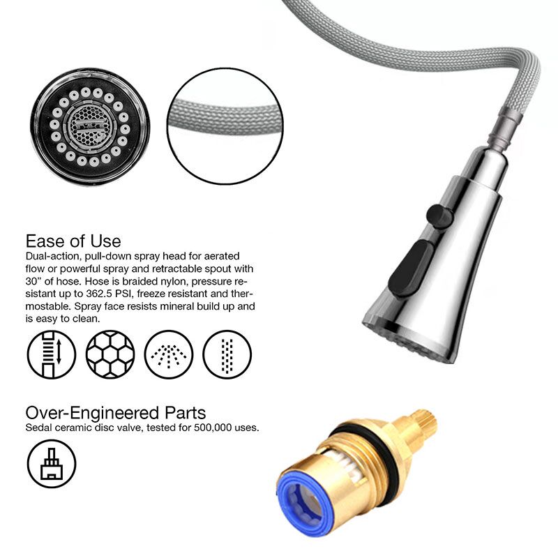 | Feature | 360-degree swivel spout Single lever water and temperature control Deck plate is available for 1, 2, 3, or 4-hole installation Nylon braided pull-down hose extends up to 25 inches Self-retracting pull-down hose keeps the spray head docked and secure when not in use Water pressure tested for industry standard Single-handle faucet moves 90 degrees forward to accommodate tight spaces Premium finish resists rust, corrosion, and tarnish Dual-function spray kitchen faucet delivers an aerated flow or powerful spray Solid brass construction with matte brushed gold finish All mounting hardware and hot/cold water lines included Faucet Measurements Spout reach: 9 ¼” Faucet height: 18″ Standard US plumbing ⅜” connections |