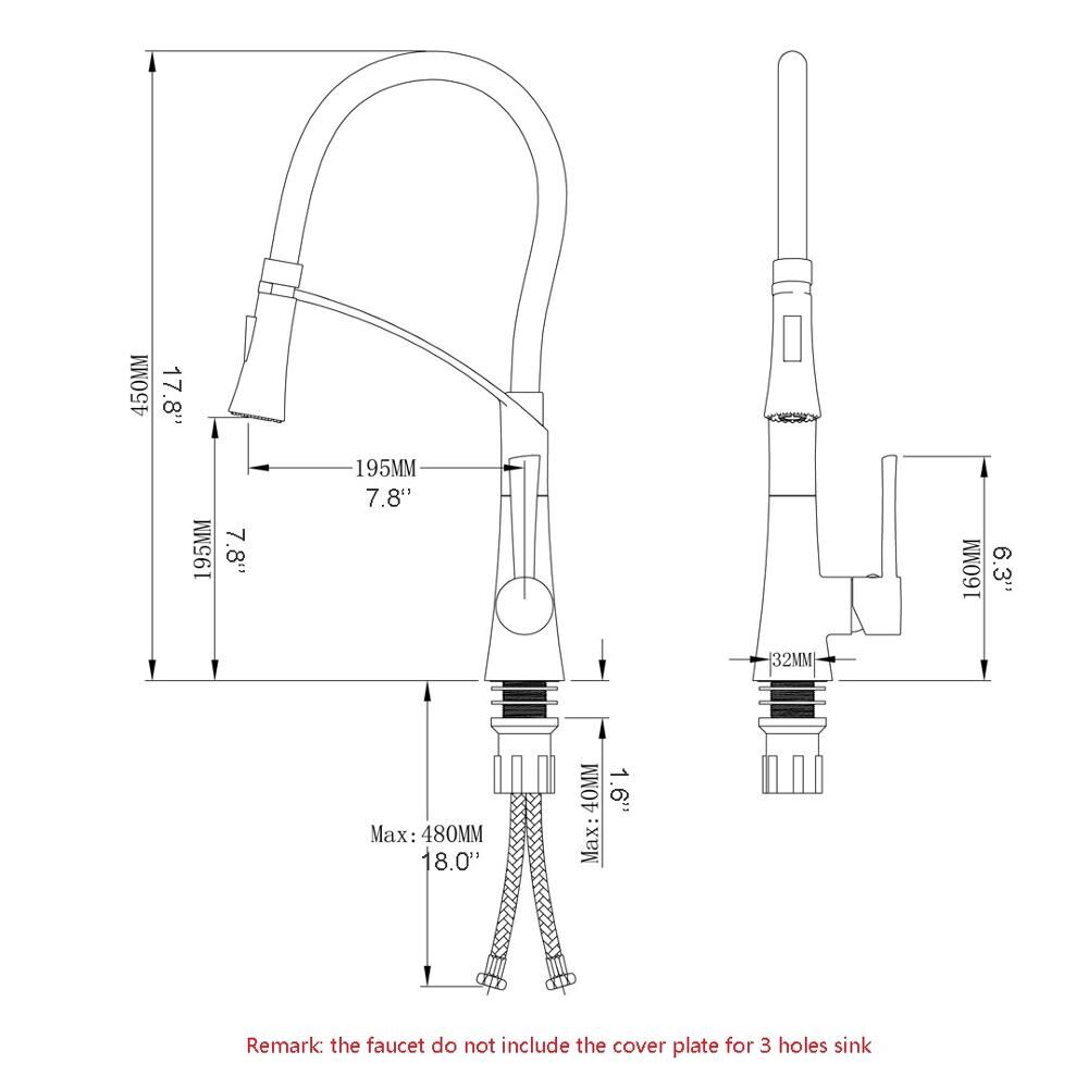 | Feature | 360-degree swivel spout Single lever water and temperature control Deck plate is available for 1, 2, 3, or 4-hole installation Nylon braided pull-down hose extends up to 25 inches Self-retracting pull-down hose keeps the spray head docked and secure when not in use Water pressure tested for industry standard Single-handle faucet moves 90 degrees forward to accommodate tight spaces Premium finish resists rust, corrosion, and tarnish Dual-function spray kitchen faucet delivers an aerated flow or powerful spray Solid brass construction with matte brushed gold finish All mounting hardware and hot/cold water lines included Faucet Measurements Spout reach: 9 ¼” Faucet height: 18″ Standard US plumbing ⅜” connections |