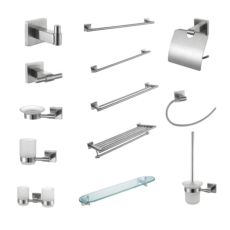 China Hotel Bathroom Accessories Set Stainless Steel Soap Dish Toilet Brush Paper Holder Robe Hook Towel Rack Sanitary Ware