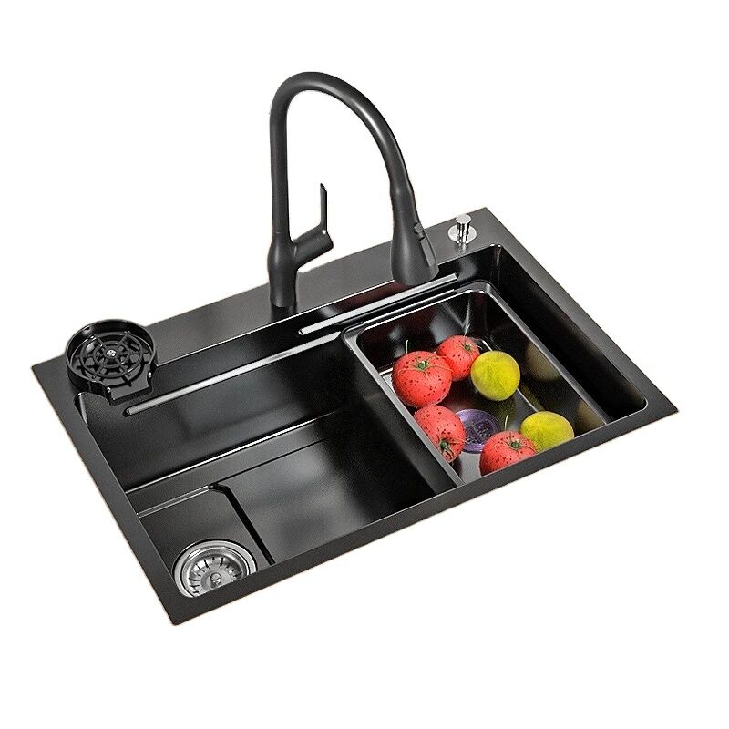 Simple Black 304 Stainless Steel Single Bowl Kitchen Sink with Pull-out Faucet and Cup Washer Clean Water Faucet for Farmhouse